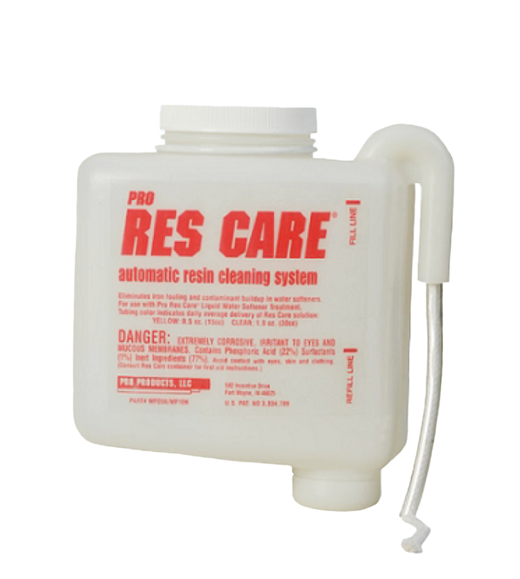 Res Care® is a specially formulated liquid resin cleaner designed to remove limited iron, manganese, silt, metal particles and organic compounds that cause softener inefficiencies. Regular use of Res Care will restore the softener back to peak efficiency and maintain the life of the unit. For best results use a Res Care Automatic Feeder or manually add during regeneration to prevent mineral build-up.